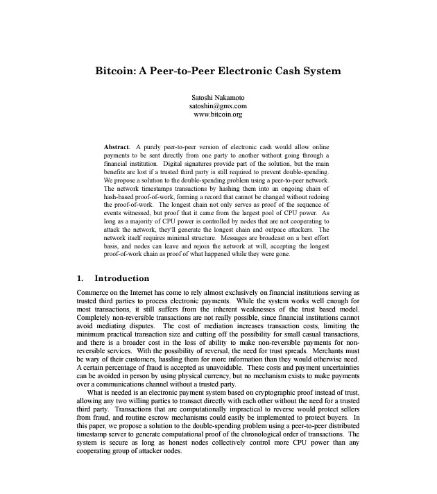 Ovaj dokument postavlja temelje za ono što se općenito smatra prvom funkcionalnom digitalnom valutom koju pokreće tehnologija distribuirane knjige pod nazivom blockchain.